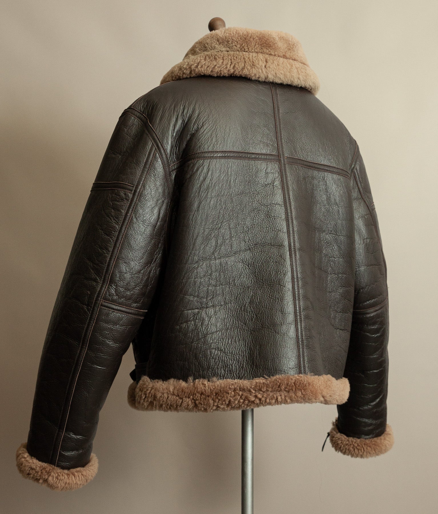 Condition is excellent throughout. The sheepskin shows no thinning, dryness, or breakdown, and the fleece remains dense and evenly distributed. The leather is supple and structurally sound, showing only light natural creasing consistent with careful wear. There are no structural concerns, and the jacket retains its full integrity and original presence.