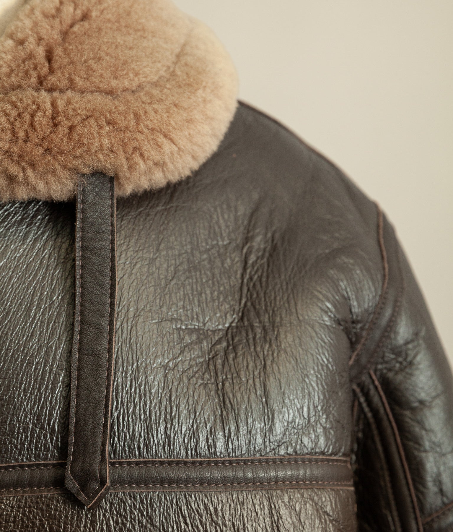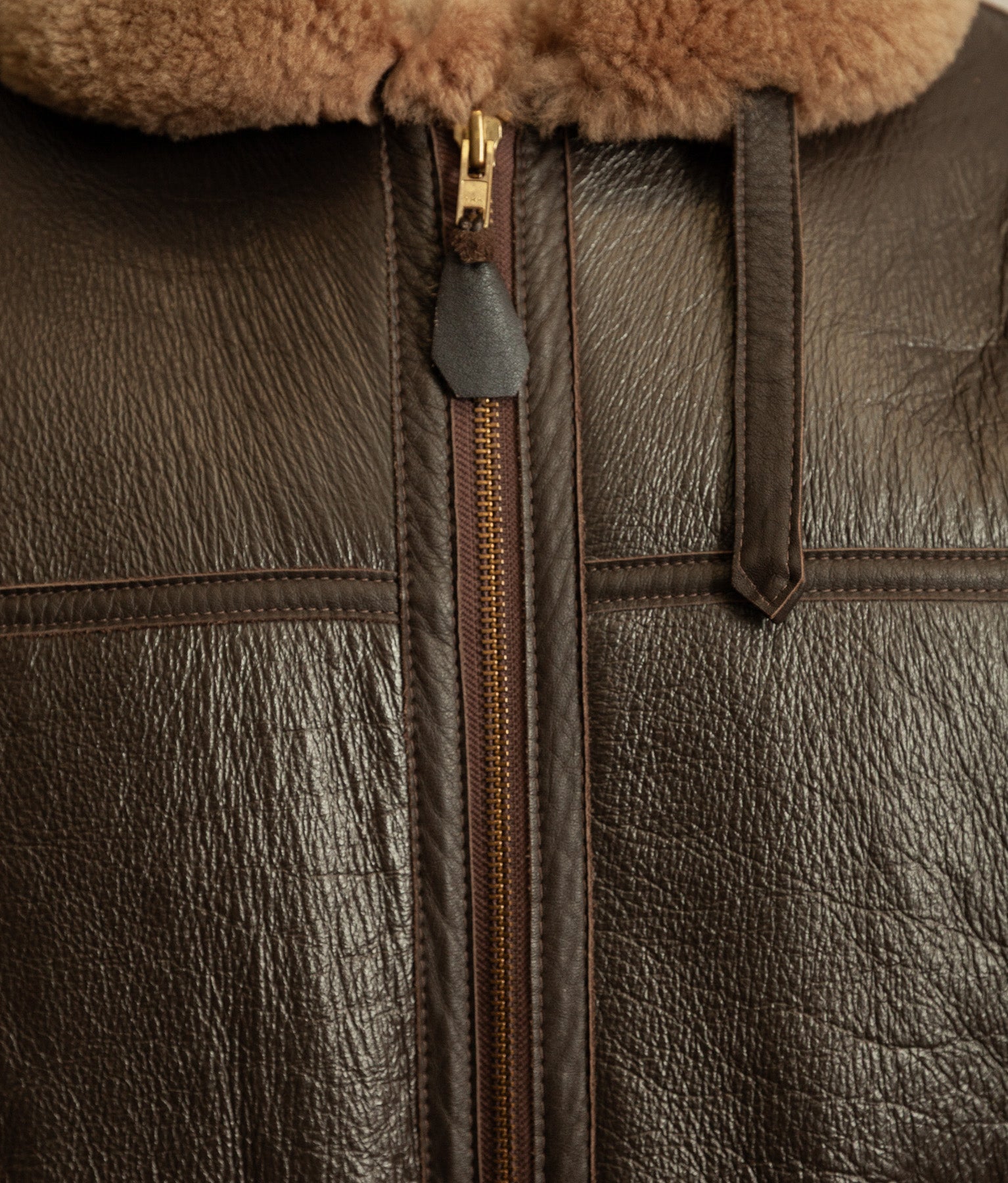 The first thing that defines this RAF Irvin is weight. The sheepskin is exceptionally heavy, dense through the fleece and firm through the hide, giving the jacket an immediate sense of purpose the moment it is handled. It carries the physical authority of a garment designed for extreme conditions, where insulation and durability mattered above all else.