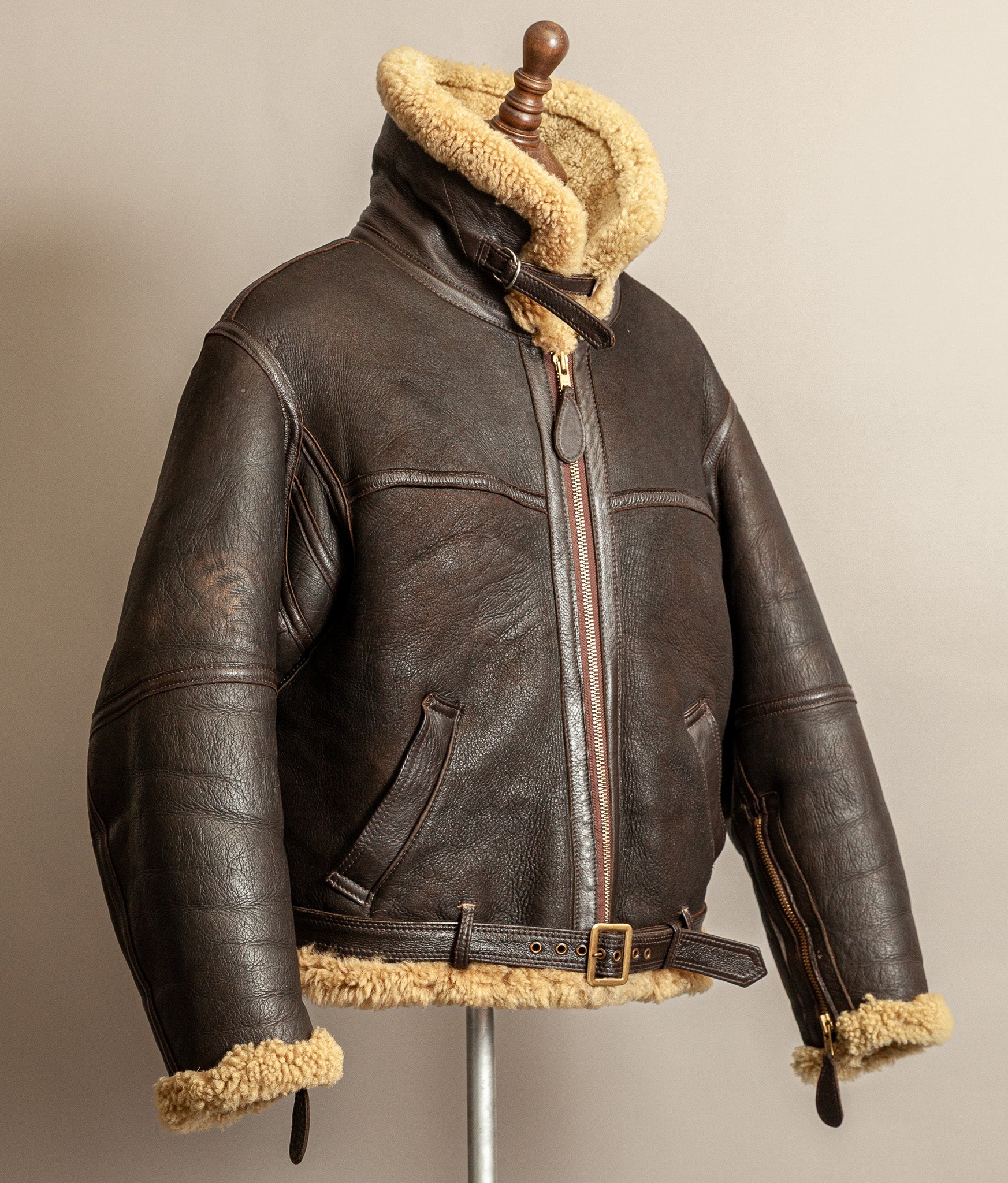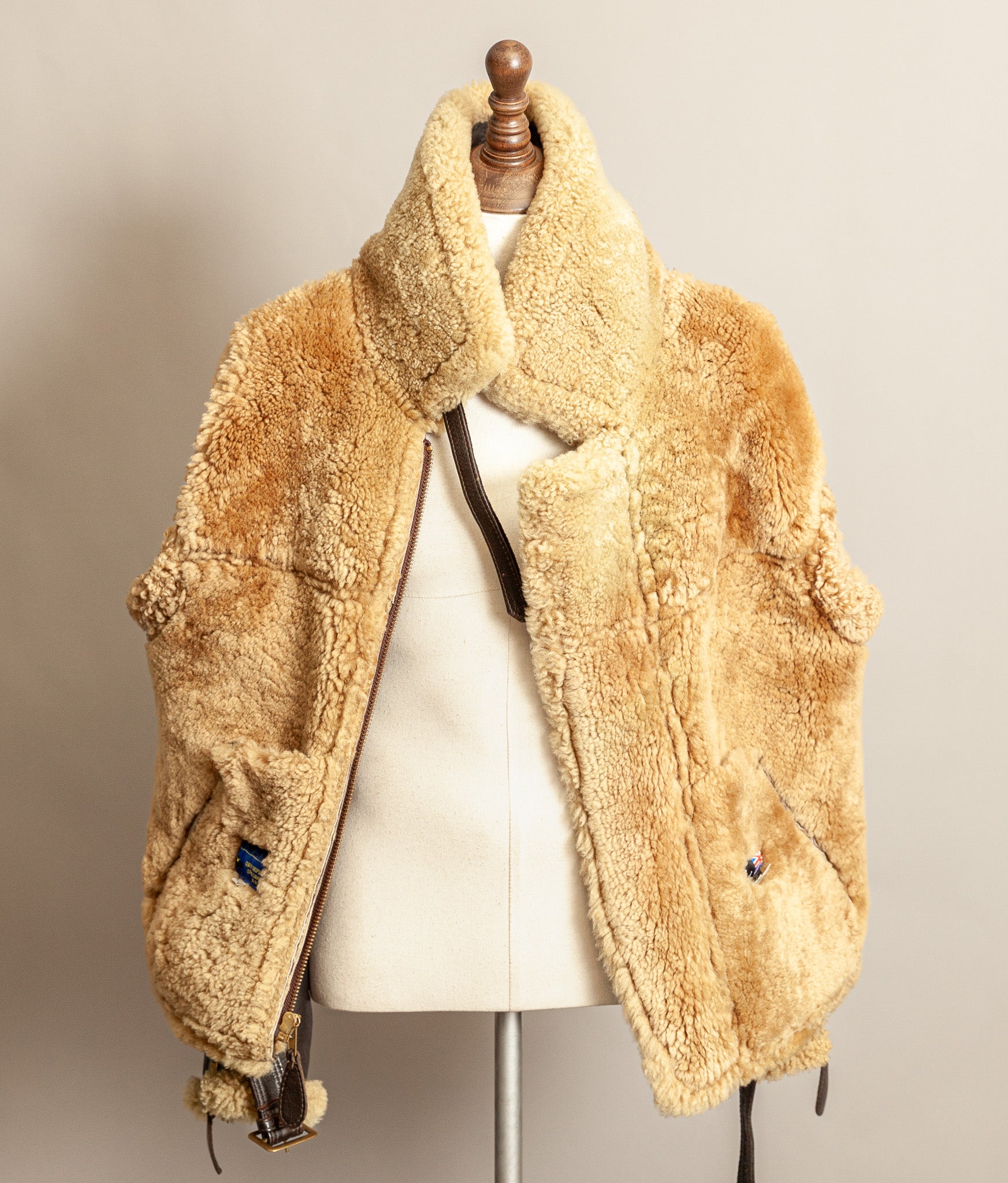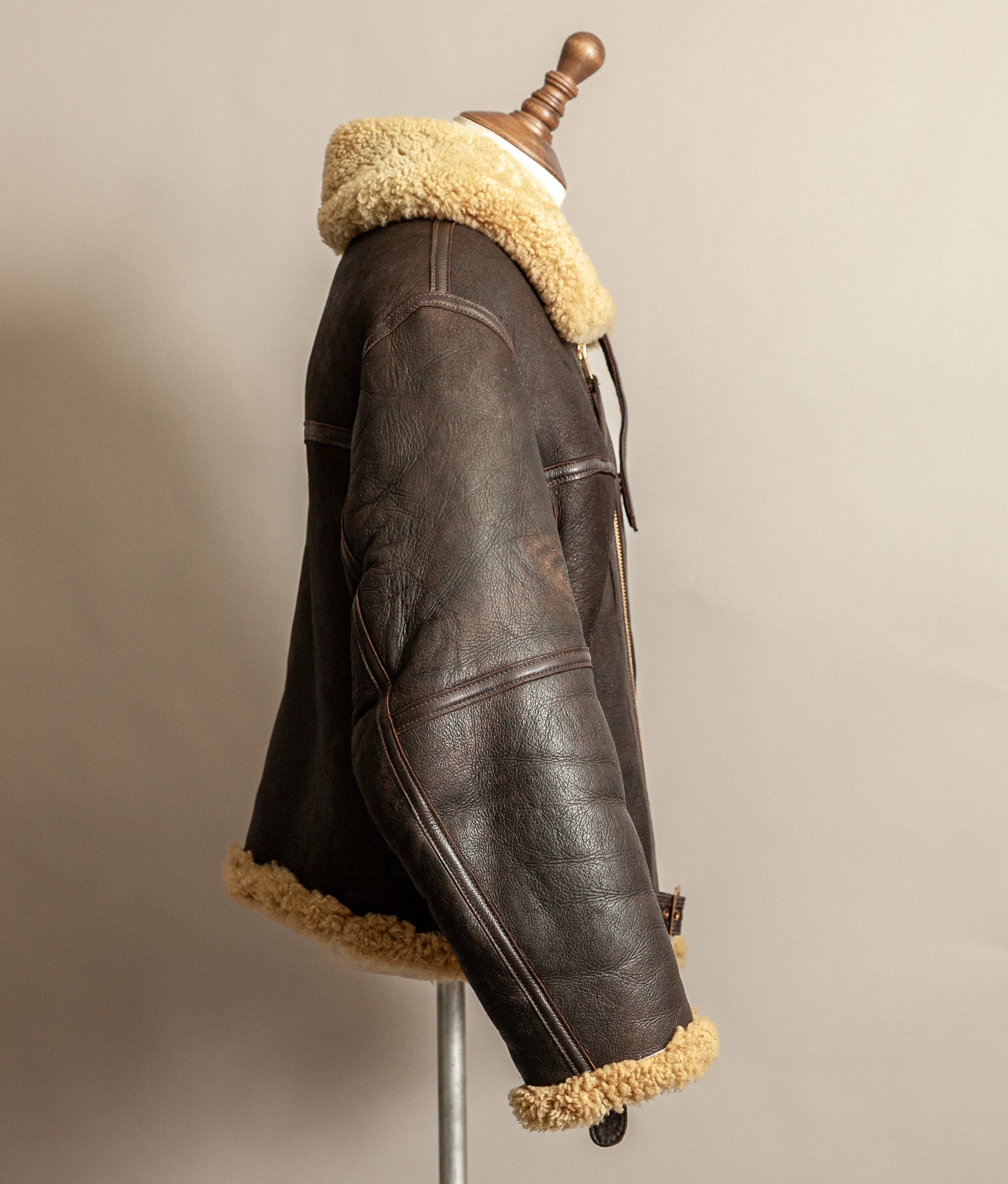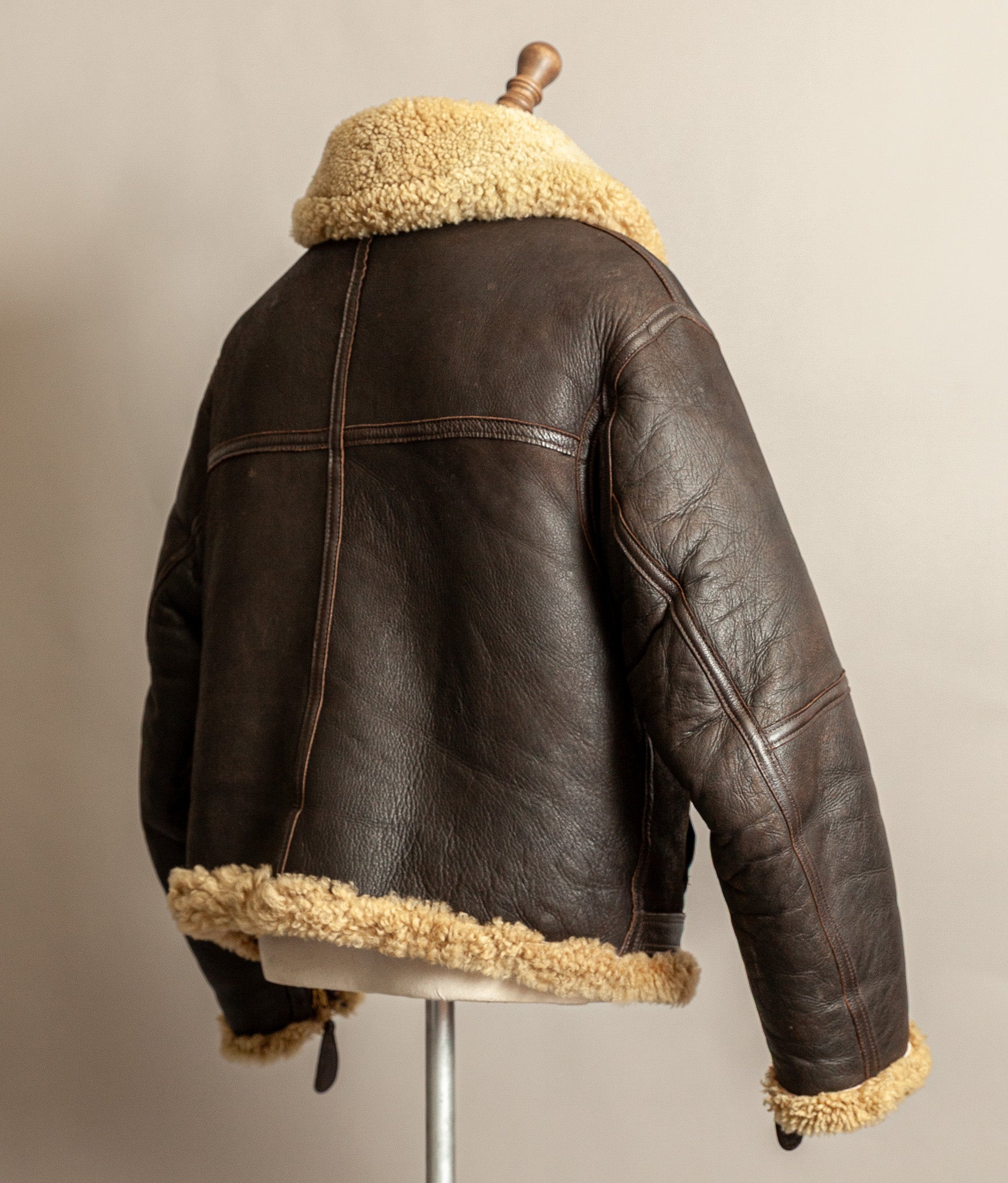 This exceptional RAF-style flying jacket, made in England by Blackbird Leather, carries forward the legacy of the original WWII Irvin design, a garment born for the skies, built to endure, and crafted with unmistakable British integrity. Substantial, authentic, and timeless, this early-1990s example embodies the rugged warmth and commanding presence that defined the great sheepskin flight jackets of the past.
