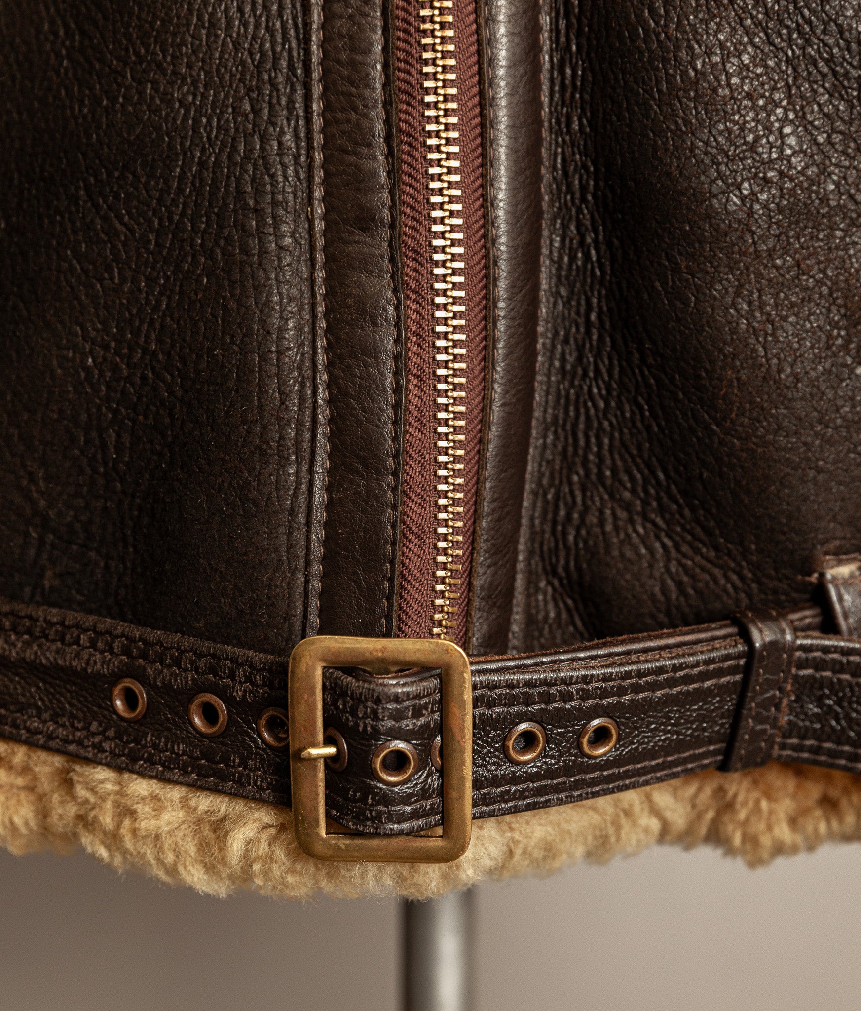 Constructed from exceptionally thick sheepskin with a rich brown outer and honey-gold fleece interior, it delivers formidable warmth and weight far beyond modern fashion grade shearling. The craftsmanship is immediately evident: sturdy main zip, belted waist, underarm eyelets, high fastening collar straps, and reinforced panels throughout. Every detail pays tribute to the original RAF Irvin pattern, rendered here with heavy English materials and a patina that tells its own story.