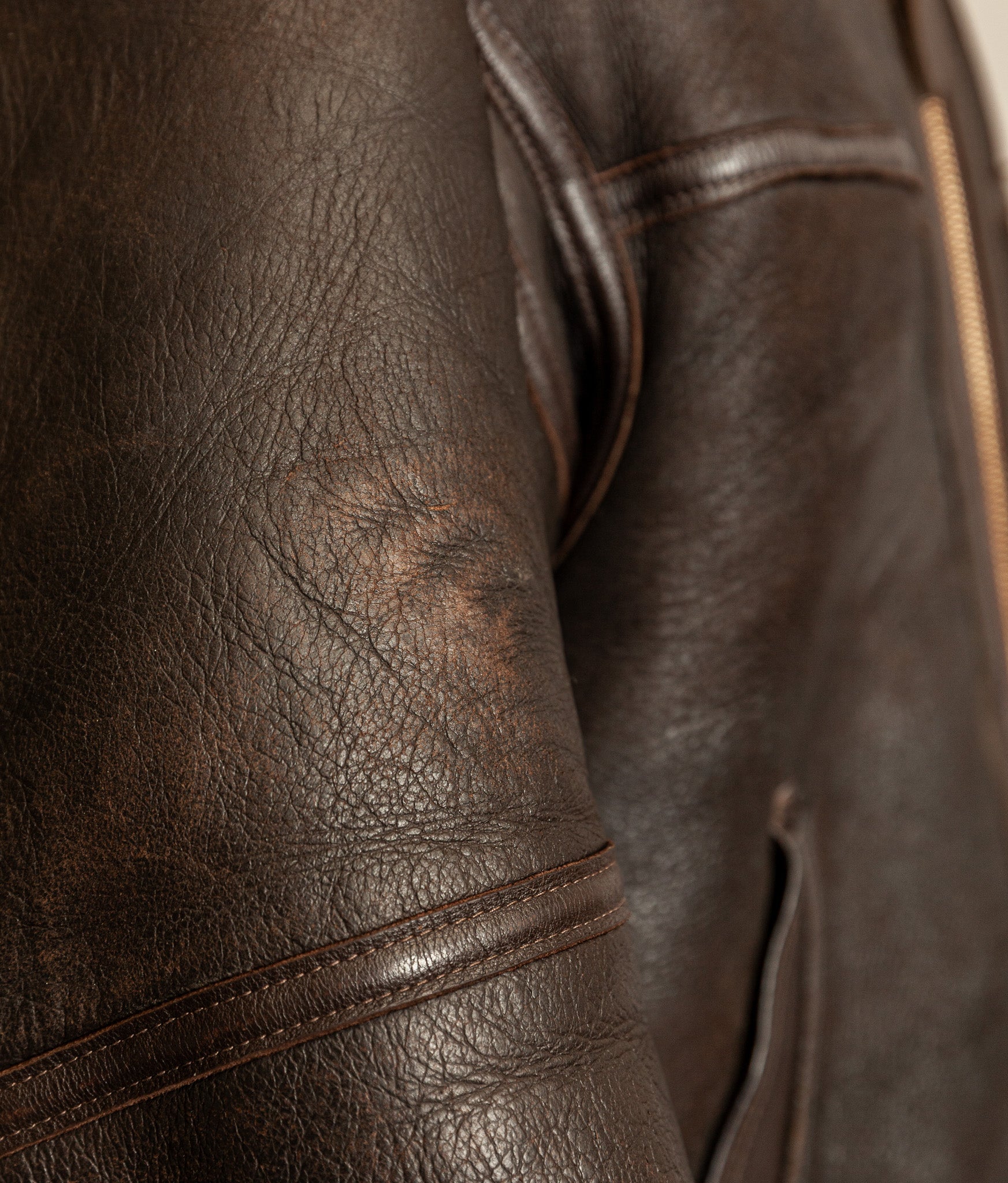 - Thick, heavyweight sheepskin with dark brown leather exterior