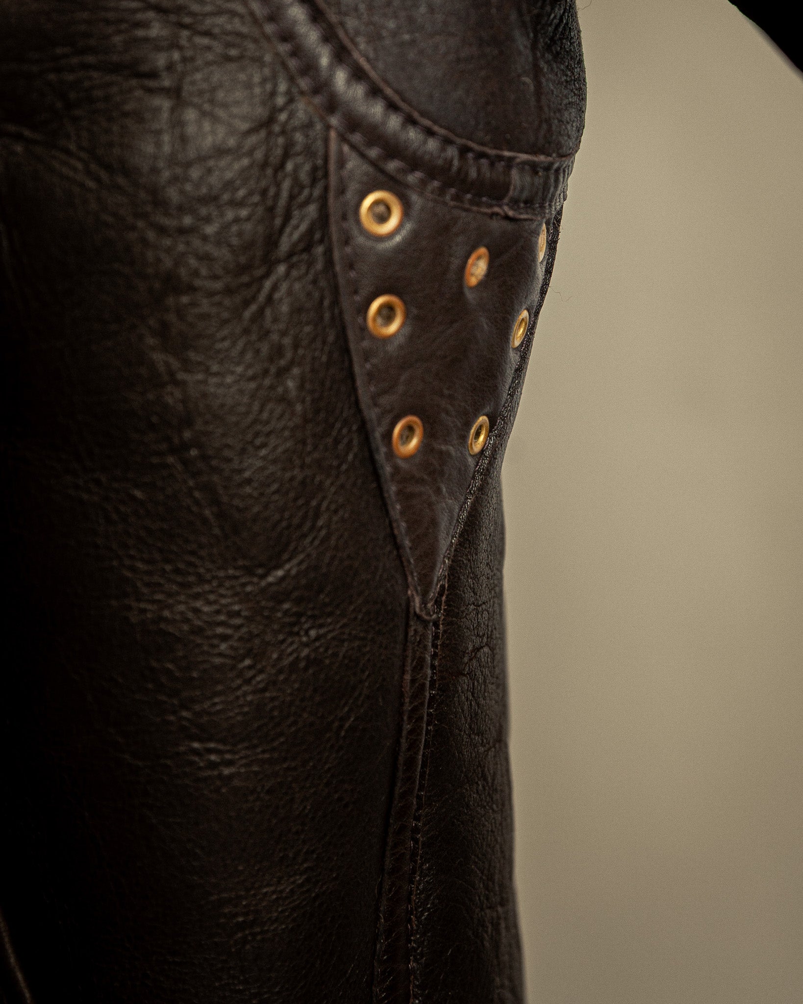 This jacket has undergone a careful, multi-stage restoration process carried out in-house. It was professionally leather-cleaned using specialist equipment to ensure both the fleece and hide were fully treated while preserving their natural depth and texture. The leather was conditioned with our own hand-formulated products to restore suppleness and resilience, and all zips and hardware were lubricated for smooth operation. The result is a beautifully preserved jacket that retains its authenticity yet feels refreshed and ready for continued wear.