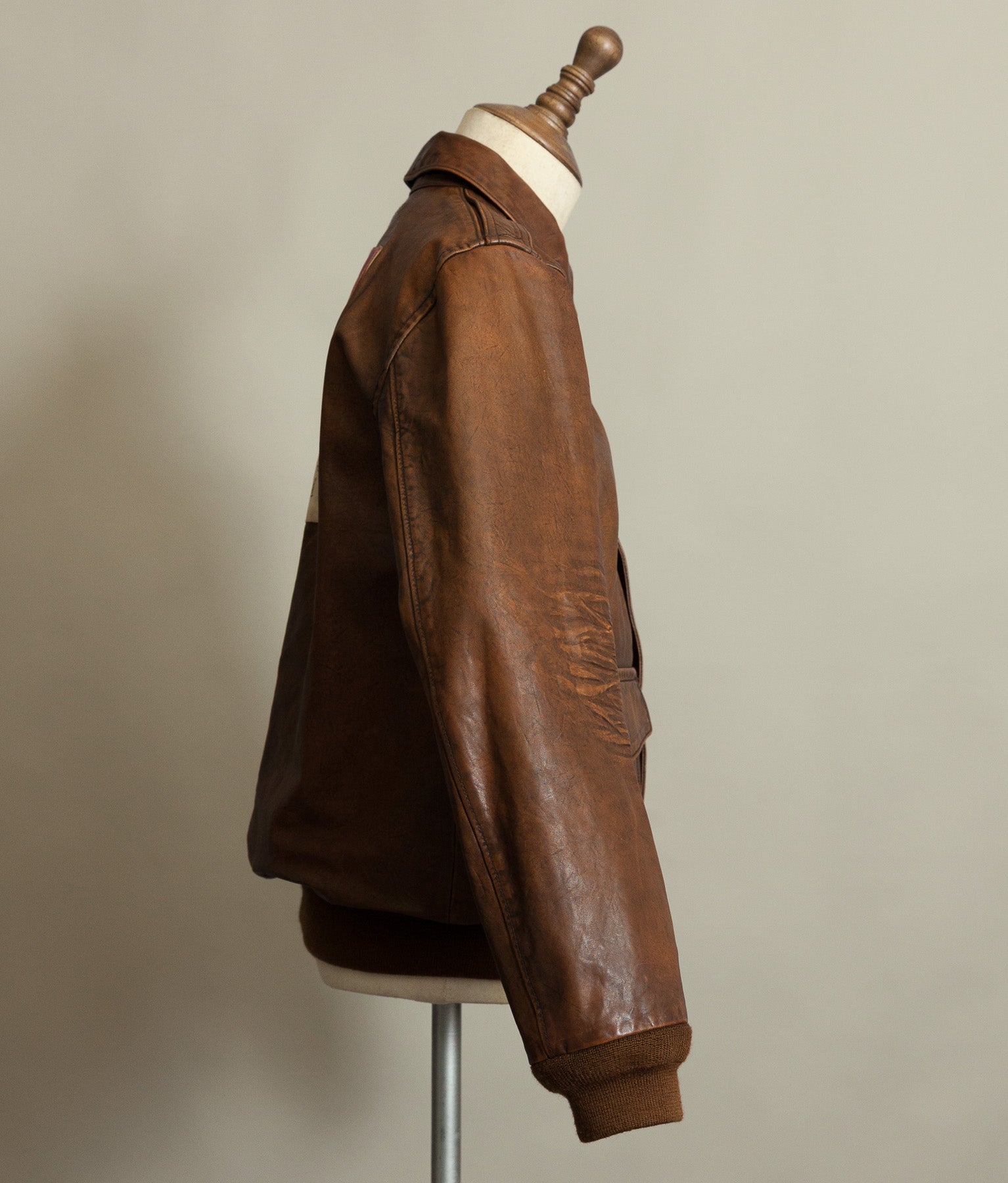 Across the chest, the USRL Pacific Air Recon patch sits alongside an aviator-style name plate, referencing wartime insignia without direct replication. The reverse carries a large leather back panel inspired by WWII theatre blood chit designs, incorporating American and period-style insignia with anchor detailing and script. Bold but integrated, the artwork adds narrative presence without overwhelming the garment.