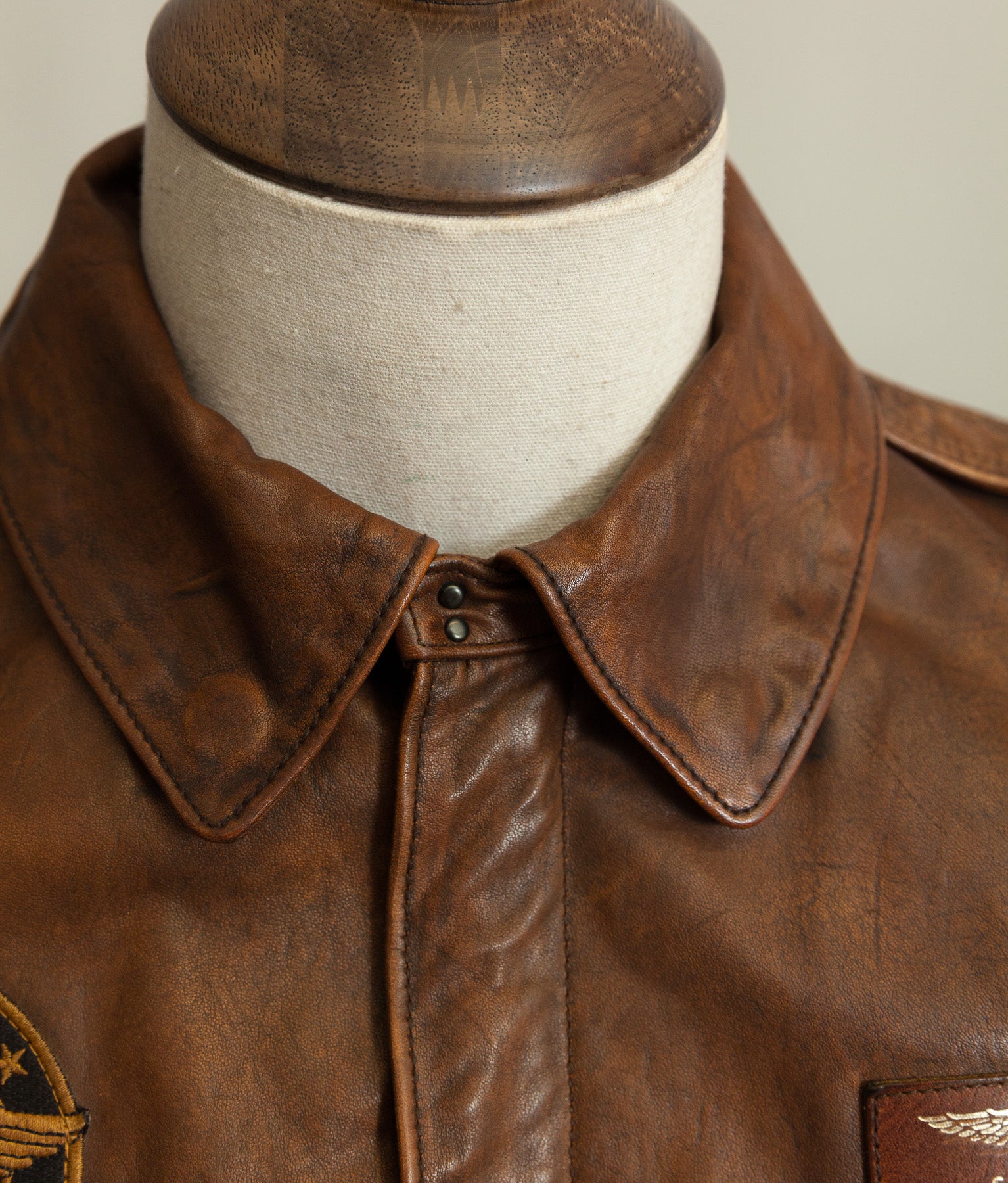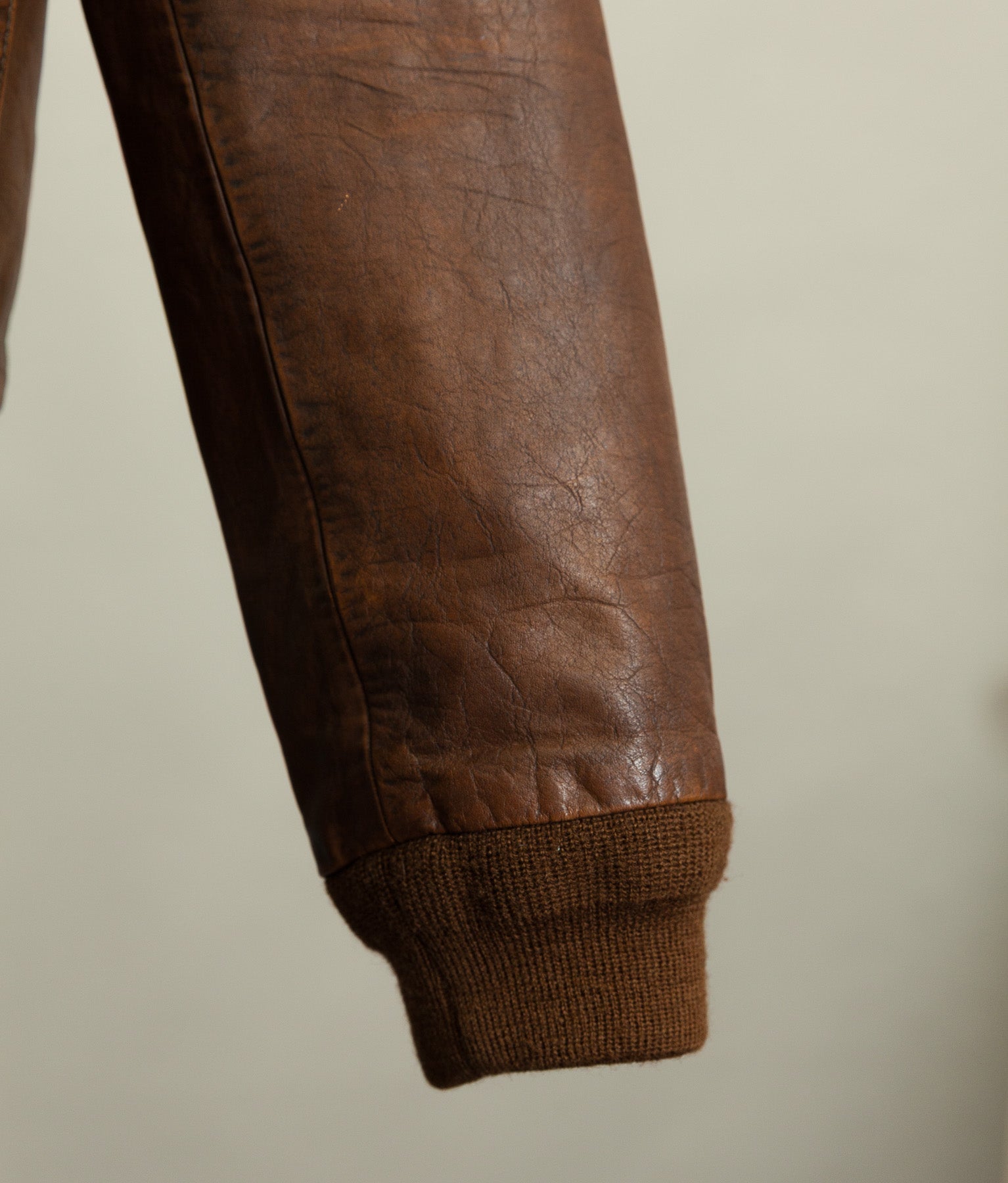 Richly burnished leather gives the surface natural tonal variation, with subtle depth visible through the sleeves and body. The hide feels firm yet supple, showing only light creasing consistent with minimal wear. No artificial distressing or exaggerated ageing is present. Surface character is authentic and restrained, the result of careful ownership rather than prolonged use. Structural integrity across all panels is excellent.