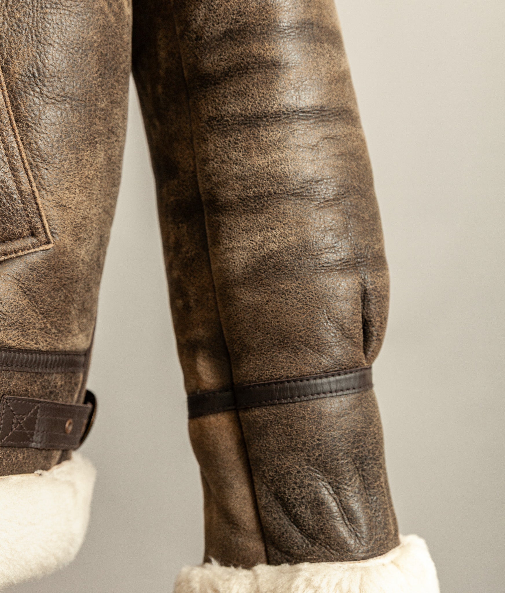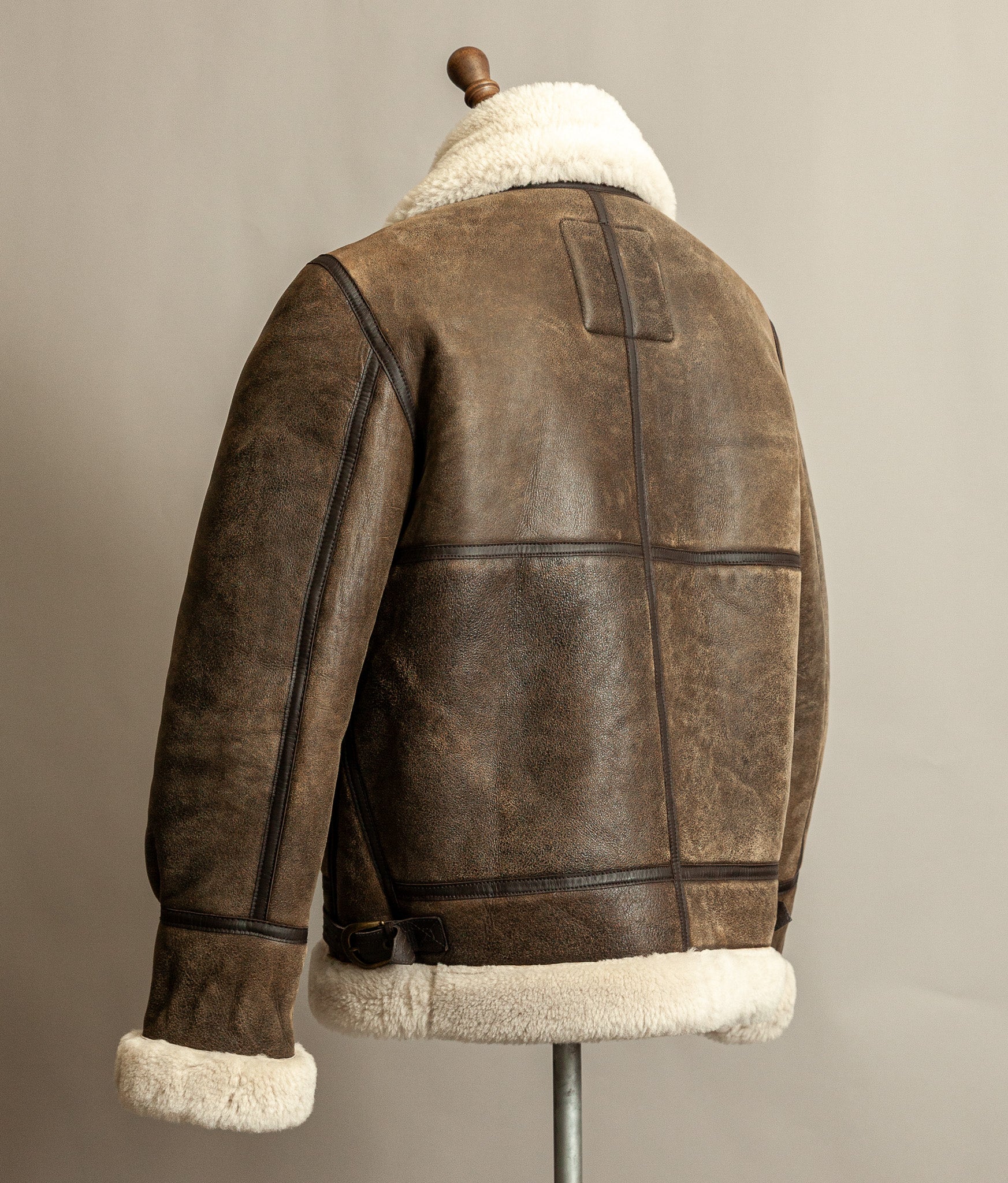 The exterior sheepskin shows a beautifully developed patina, deep, varied, and rich with tonal character. Years of careful wear have shaped a surface that feels alive, every crease and shade adding to its depth. The white shearling interior remains plush and substantial, providing structure, insulation, and that unmistakable tactile luxury that only genuine sheepskin delivers. Classic B-3 details define the silhouette: wide panel construction, double throat buckles, rolled shearling edges, and reinforced seam binding that speaks to the jacket’s rugged origins.
