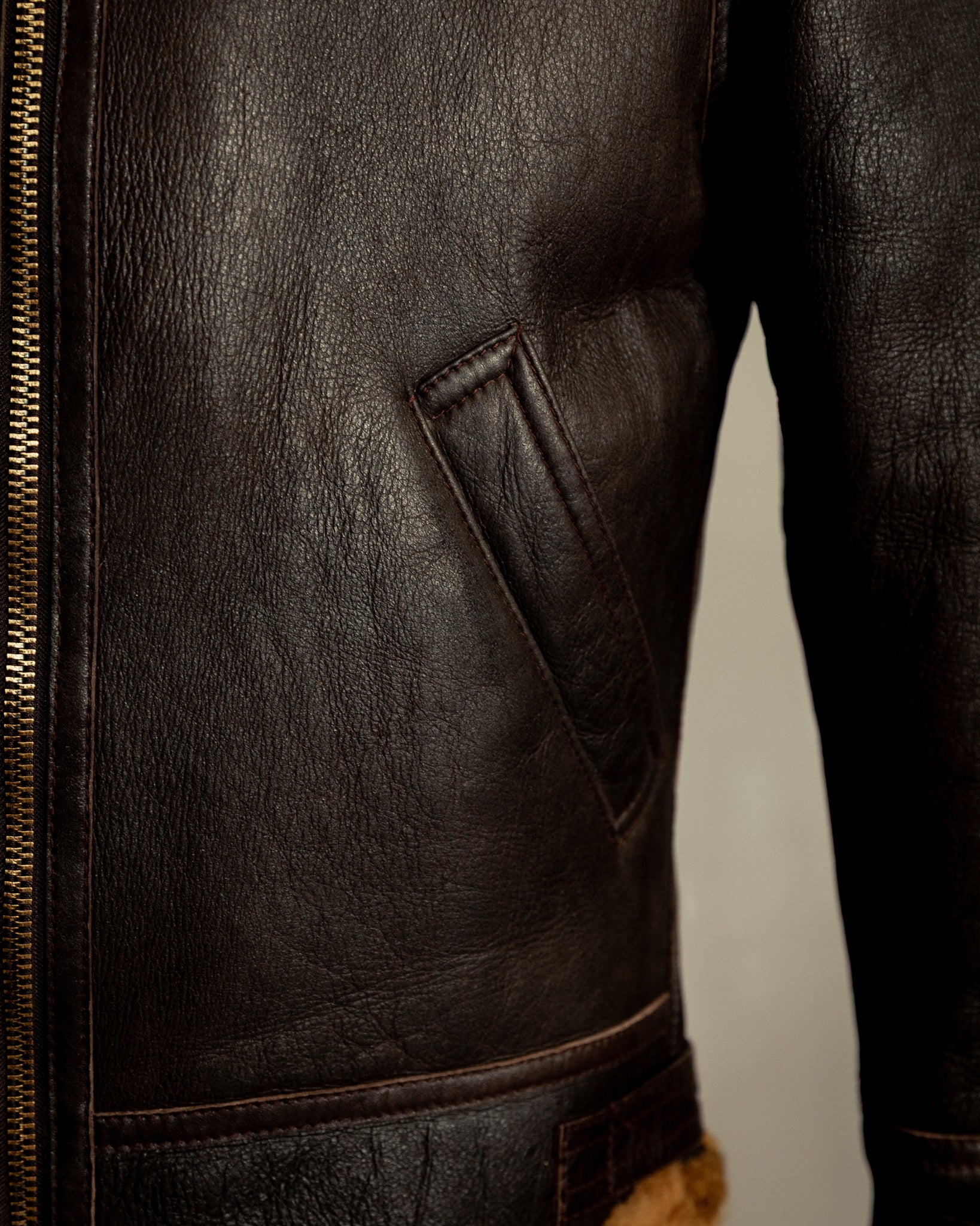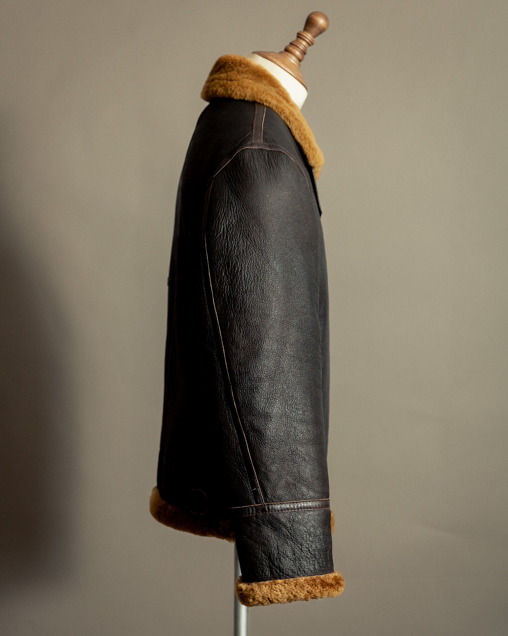 Carrying the legacy of the original WWII USAAF Type B-3, this vintage example reflects the same uncompromising spirit and technical precision that defined early aviation wear. Crafted from full-weight sheepskin with a rich dark brown exterior and golden fleece interior, it embodies the durability, warmth, and understated beauty that made the B-3 an enduring icon of flight.