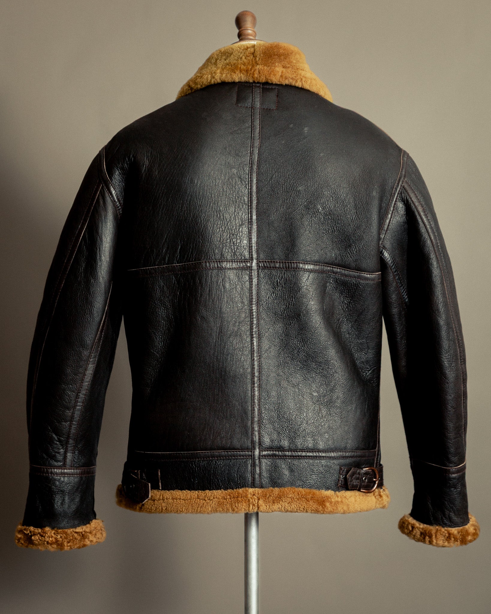 Restored with care to maintain both integrity and natural texture, this jacket has undergone a full professional leather clean and conditioning process in-house. The sheepskin was deeply nourished to revive its suppleness and tone, the fleece refreshed to restore softness, and the hardware cleaned and lubricated for smooth function. The result is a jacket that feels alive — true to its original purpose yet ready for continued life in the present.