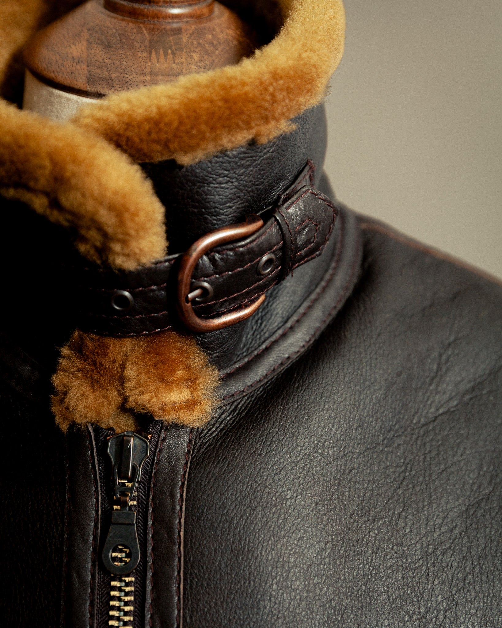The surface displays a natural grain with gentle tonal depth and light, even distressing that enhances its vintage character without compromise to structure. The fleece remains soft, dense, and insulating — designed for altitude, refined for everyday wear. Functional detailing includes a heavy-duty metal zip, high shearling collar with throat latch strap, and adjustable side buckles — all combining strength with elegance. A tactile, beautifully balanced jacket that bridges authenticity and wearability.