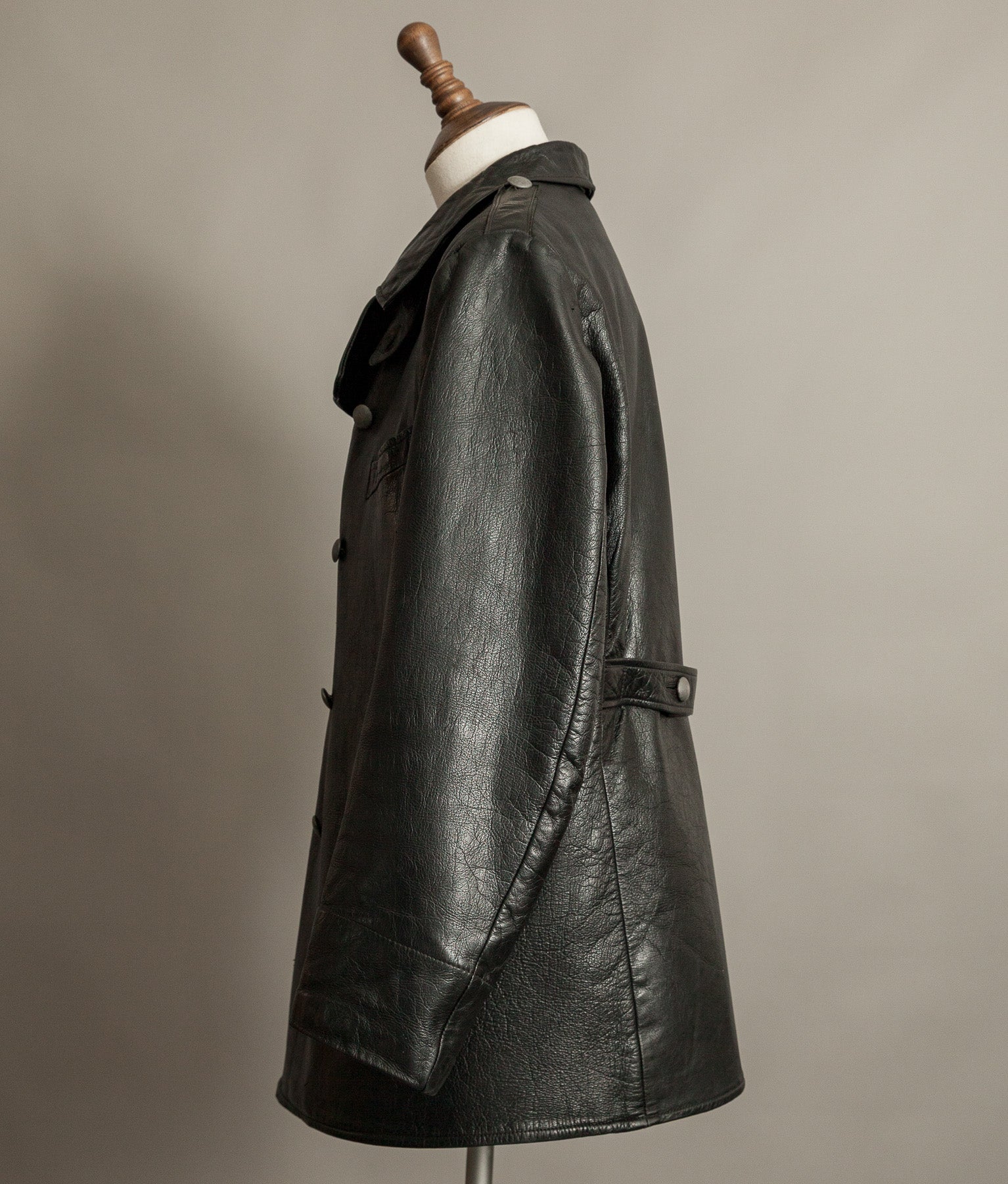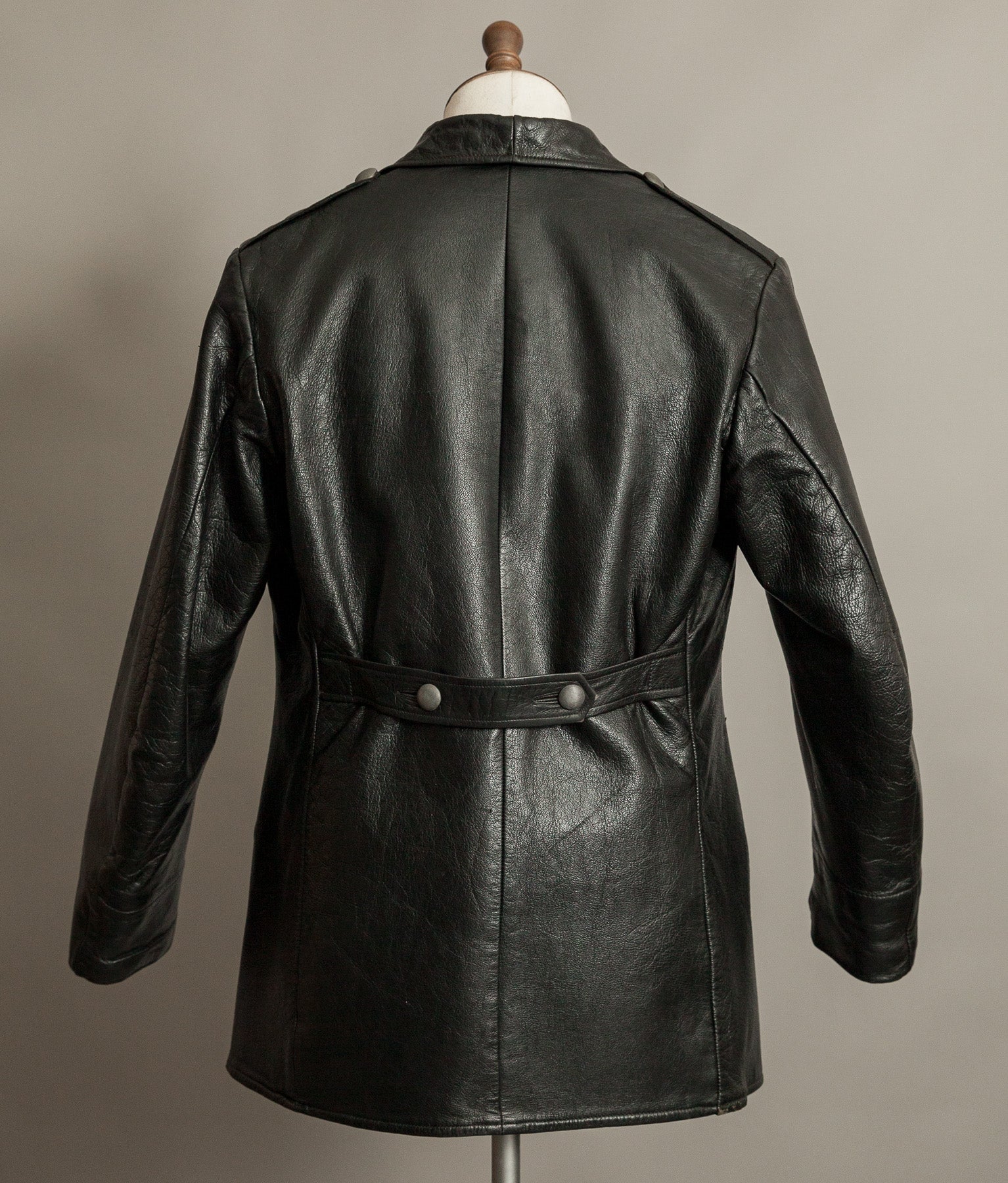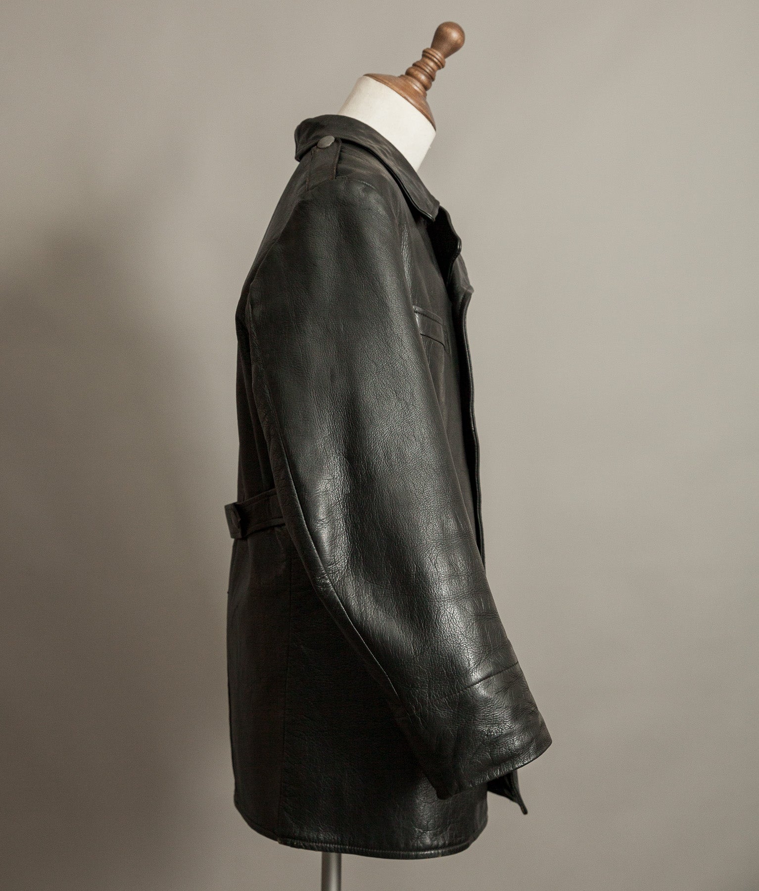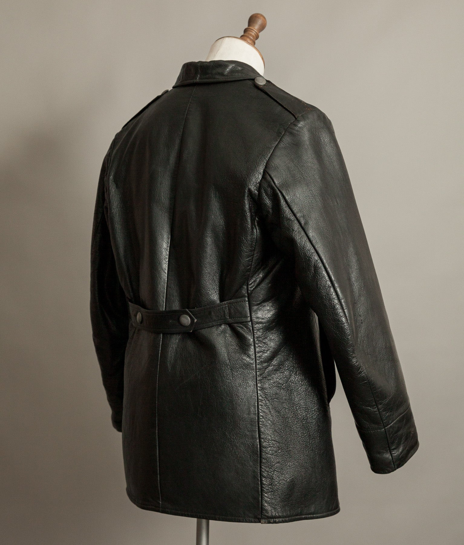 The black goatskin is the defining element. Dense yet flexible, selected for resilience without unnecessary weight. It carries the kind of tight, expressive grain only period goat develops, now settled into an even, composed patina. The leather retains excellent structure and presence. It stands correctly on the body. It feels substantial in the hand.