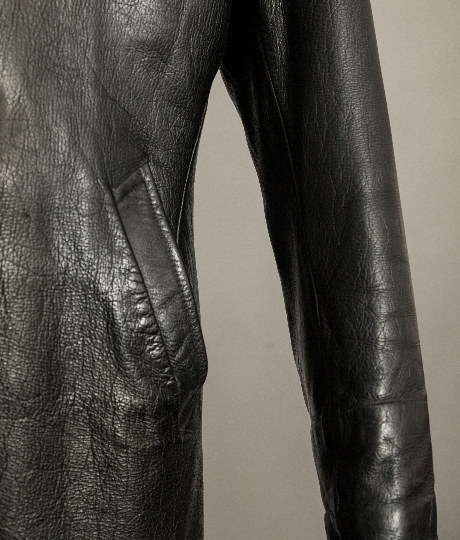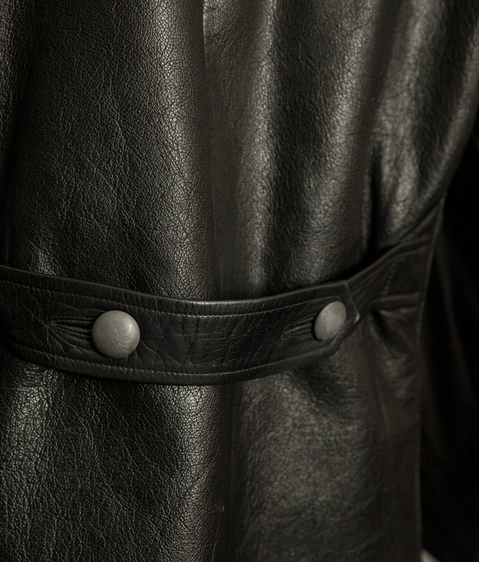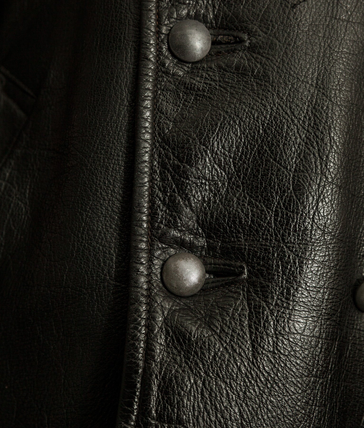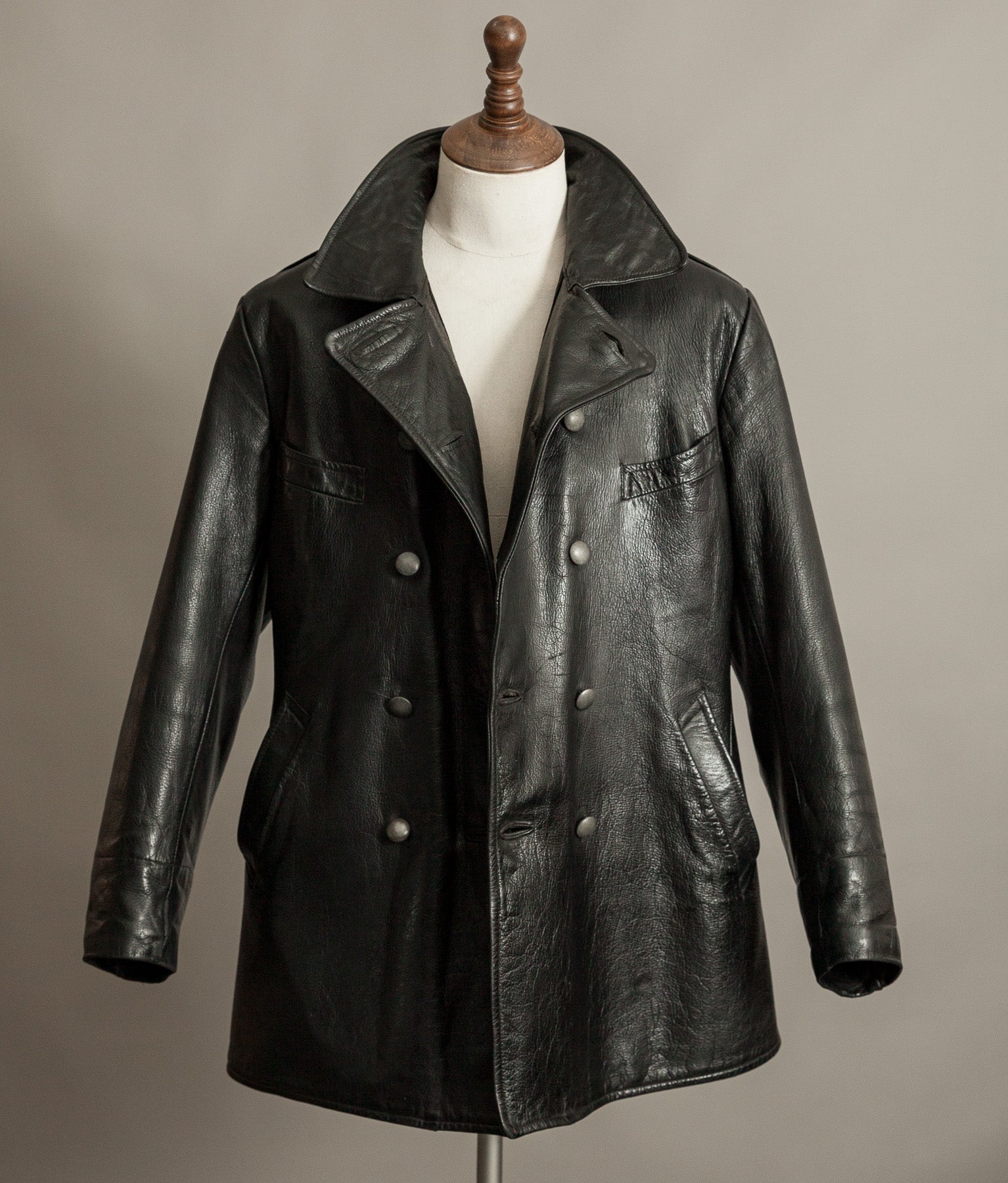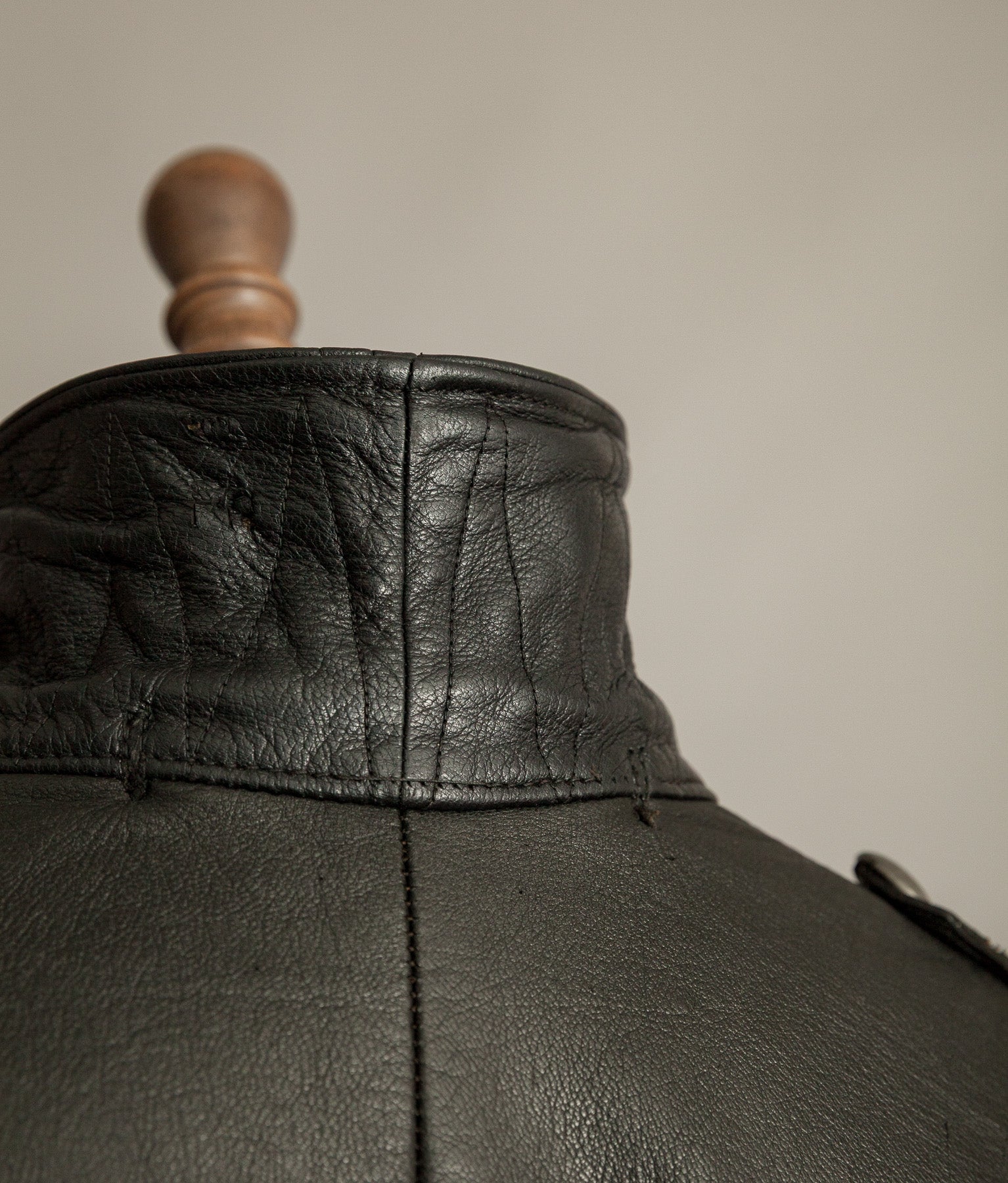The black goatskin is the defining element. Dense yet flexible, selected for resilience without unnecessary weight. It carries the kind of tight, expressive grain only period goat develops, now settled into an even, composed patina. The leather retains excellent structure and presence. It stands correctly on the body. It feels substantial in the hand.
