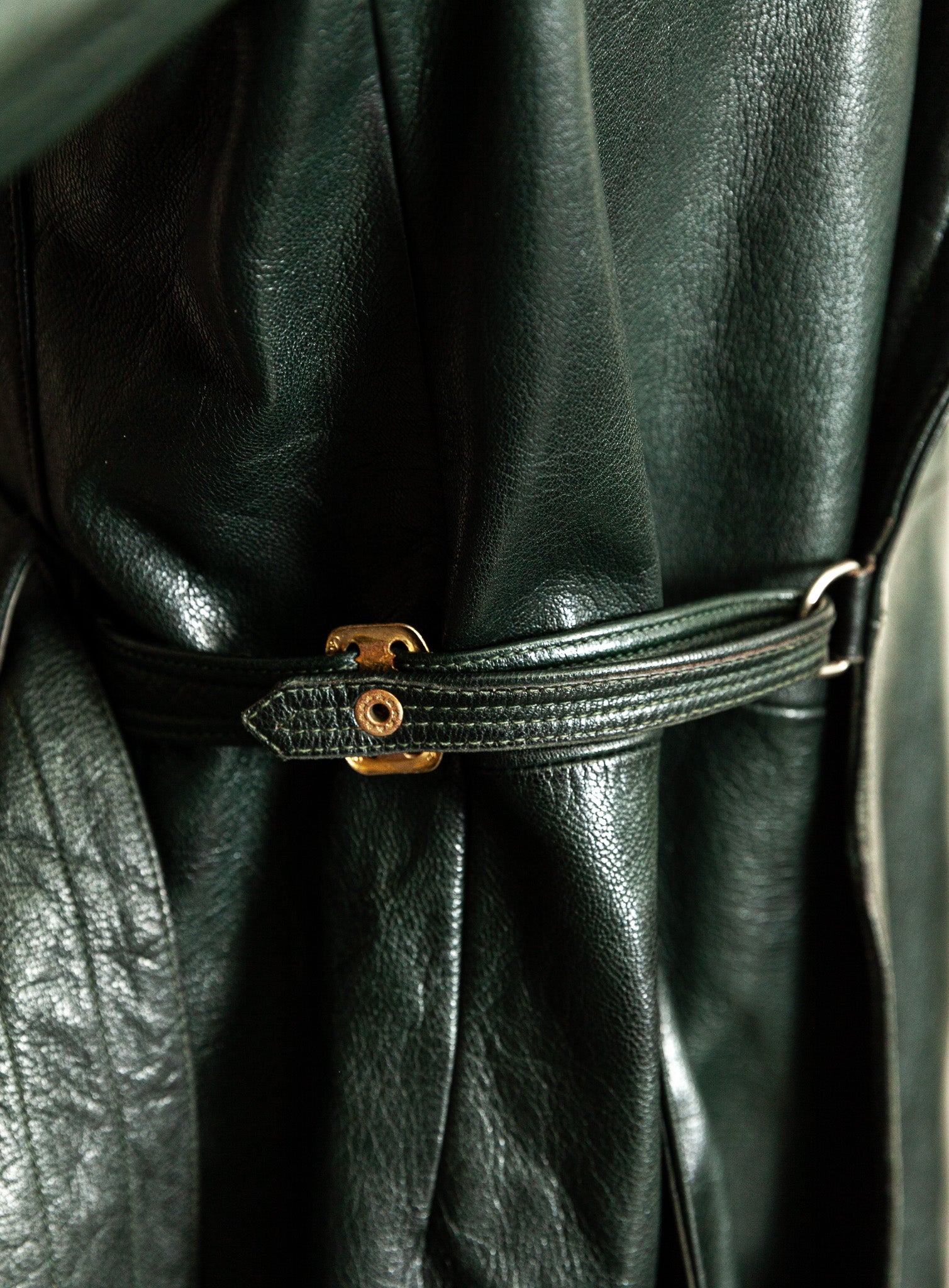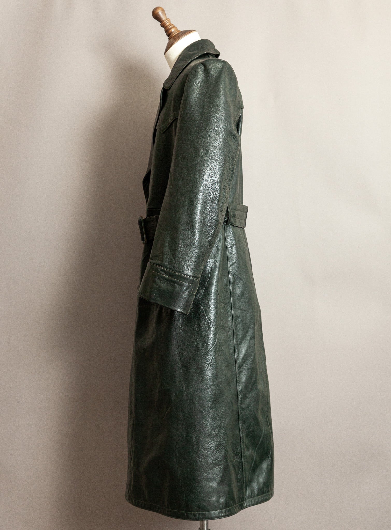 This piece has been specialist leather cleaned and professionally conditioned, preserved rather than over-restored to safeguard both its longevity and authenticity. The patina, grain, and natural character remain intact. The belt buckle shows gentle, age-appropriate wear, but the structure of the coat is exceptional: seams remain strong, the lining is intact, and the leather retains its weight, drape, and power.