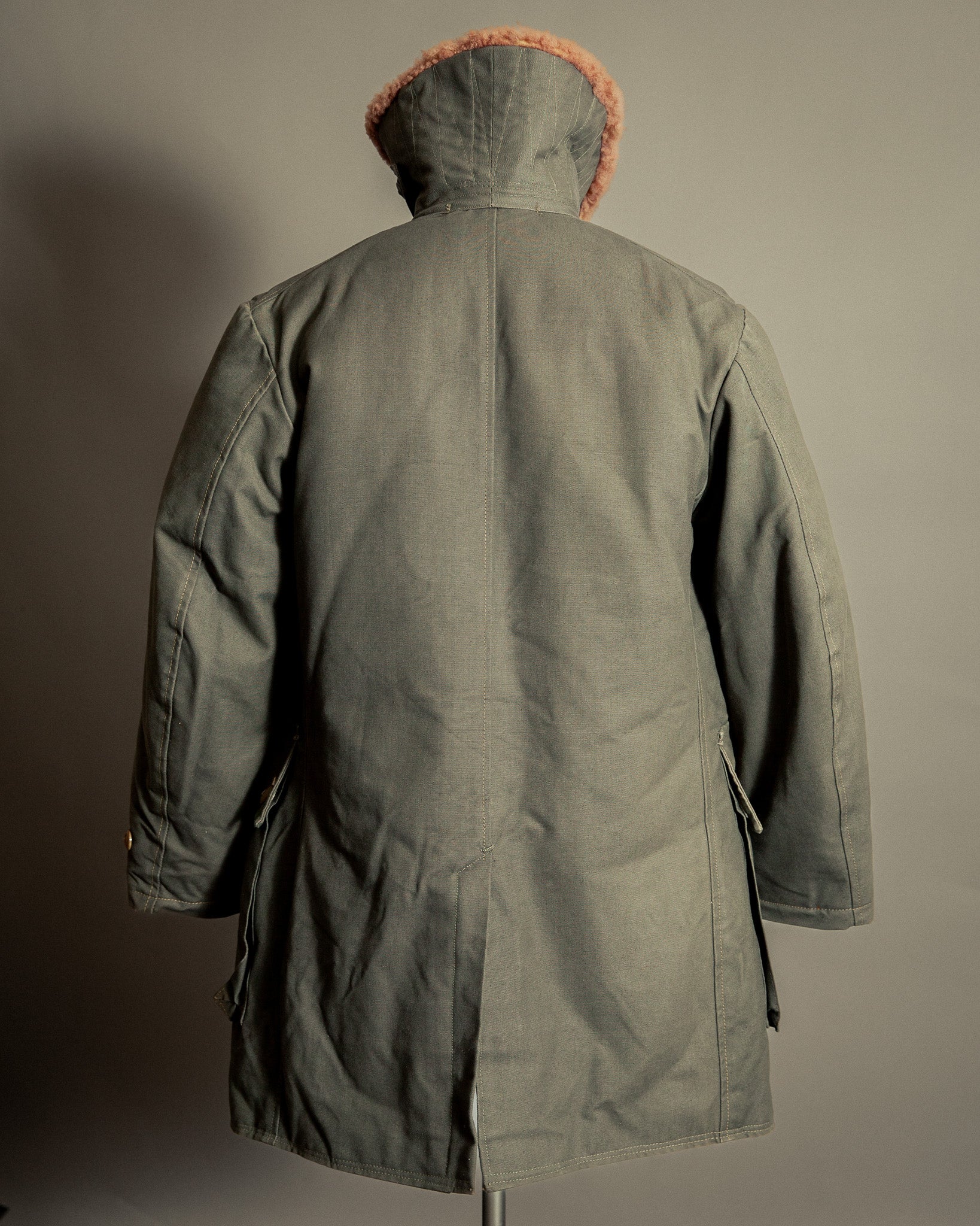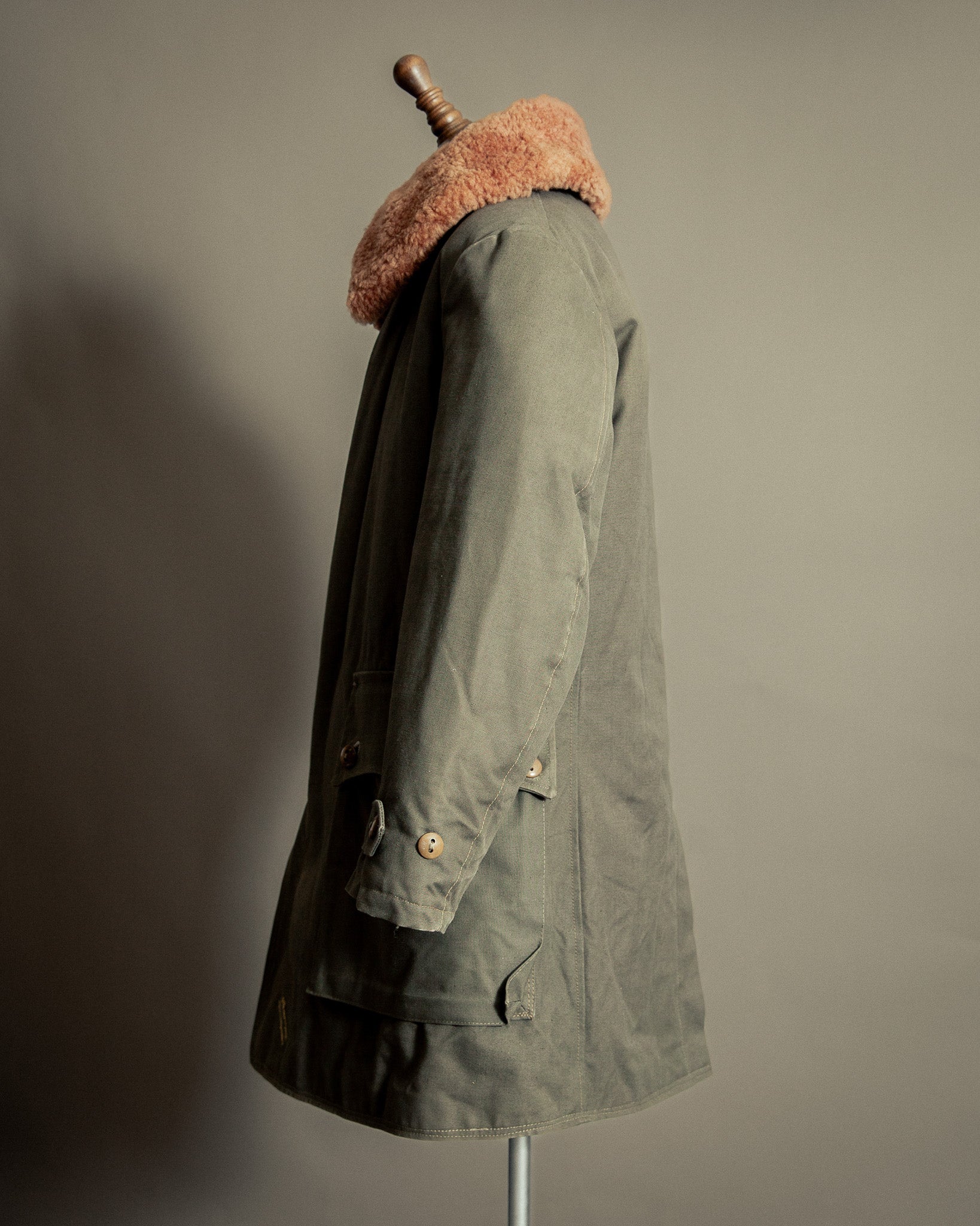 This example remains in exceptional condition throughout — a superior and rarely seen example. The entire coat has been specialist dry cleaned in-house using advanced systems formulated for vintage military garments, ensuring both the outer shell and interior fleece were cleansed and preserved. The canvas exterior has been reproofed to restore its original weather resistance and deep olive tone, while the sheepskin lining retains its full, luxurious pile and natural softness. Every feature — from the leather-backed buttons to the reinforced seams and original maker’s label — remains beautifully intact.